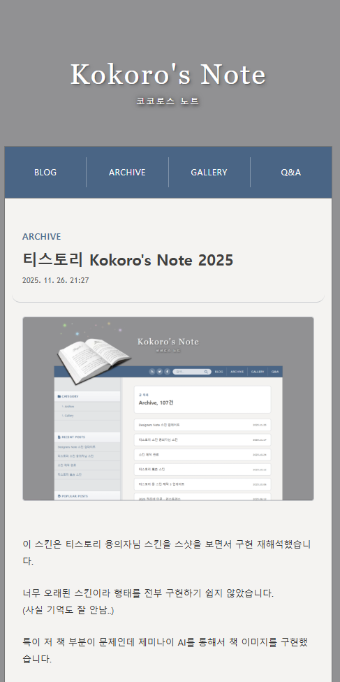 이 스킨은 티스토리 용의자님 스킨을 스샷을 보면서 구현 재해석했습니다.